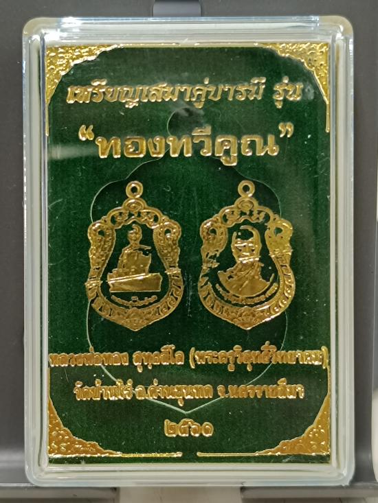 @@ เหรียญเสมาคู่บารมี หลวงพ่อคูณ/หลวงพ่อทอง รุ่น "ทองทวีคูณ" หลวงพ่อทอง สุทฺธสีโล วัดบ้านไร่ จ.นครราชสีมา เนื้ออัลปาก้าลงยา หน้ากากทองทิพย์ สร้าง 199 เหรียญ หมายเลข 30 พร้อมกล่อง