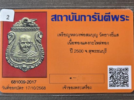 เหรียญหลวงพ่อสมบุญ วัดยางยี่แส เนื้อทองแดงกะหลั่ยทอง จ.สุพรรณบุรี ปี2500 สวยครับพร้อมบัตรรับรอง