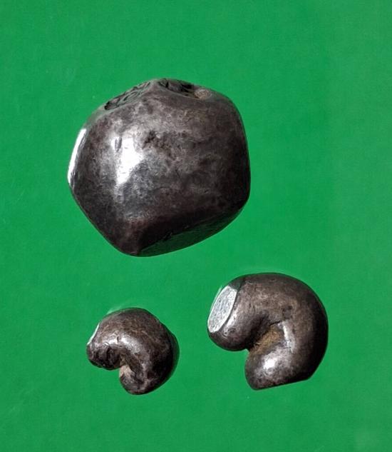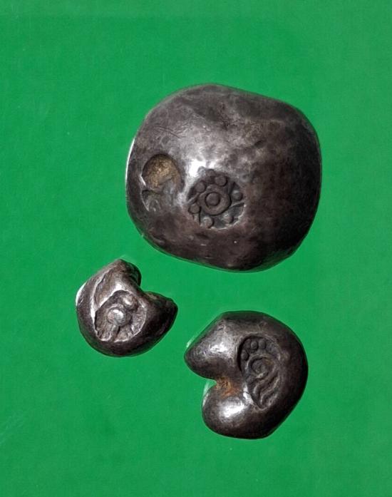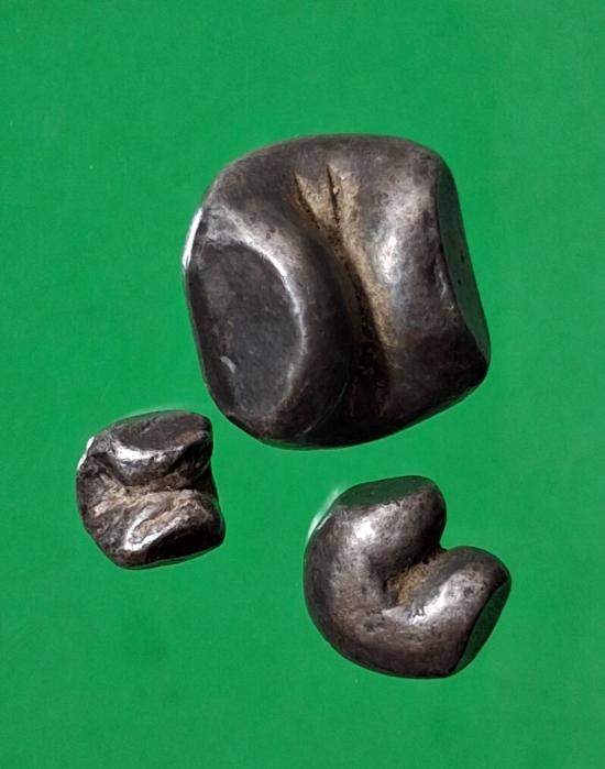 เงินพดด้วงโบราณ จำนวนสามเม็ด น่าจะหนักประมาณ 1 บาทกว่าครับ