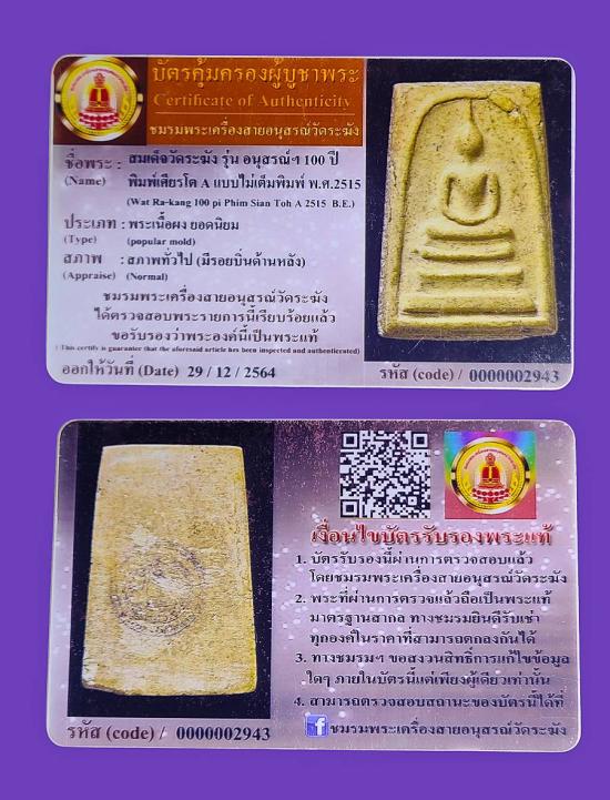 | รายละเอียด | พระสมเด็จ 100 ปีวัดระฆัง พิมพ์ใหญ่เศียรโต A แบบไม่เต็มพิมพ์ ปี 2515 (นิยม) เป็นรองแค่แบบเต็มพิมพ์ครับ ราคาเบากว่า แต่ตรายางด้านหลังสวยระฆังเกือบเต็มใบ มีกระเทาะใต้ฐานหลังล่างซ้ายนิดครับ มาพร้อมบัตรรับรองของชมรมอนุสรณ์วัดระฆัง(สายตรงสยวัดระฆัง)และบัตรการันตีพระครับ