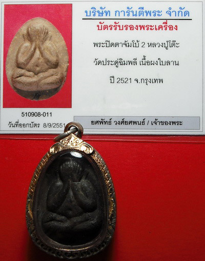 | รายละเอียด | ปิดตาจัมโบ้2 เนื้อผงใบลาน พิมพ์คม สวยๆ นิ้วชัดๆ เลี่ยมตลับเงินกันน้ำพร้อมบัตรรับรอง G-PRA