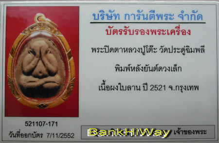 | รายละเอียด | พระปิดตาหลังยันต์ดวงเล็ก เนื้อผงใบลาน สวยคมชัดเดิมๆ เลี่ยมทองหนาๆพร้อมบัตรรับรอง
