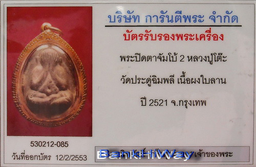 | รายละเอียด | พระปิดตาจัมโบ้ 2 เนื้อผงใบลาน บรรจุตะกรุดเงิน 1 ดอก หลวงปู่โต๊ะปลุกเสก 3 ไตรมาส (ปี 2521-2523)