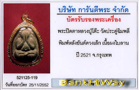 | รายละเอียด | พระปิดตายันต์ดวงเล็ก เนื้อผงใบลาน ตะกรุดเงิน 1 ดอก หลวงปู่โต๊ะปลุกเสก 3 ไตรมาส ปี 2521-2523