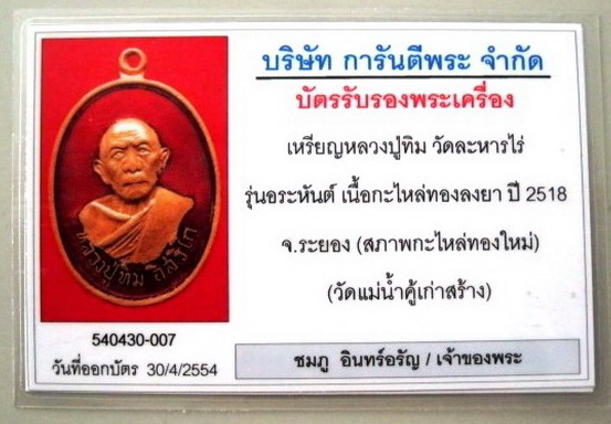 | ชื่อพระเครื่อง | เหรียญหลวงปู่ทิม กระไหล่ทองลงยาสีแดงกรรมการ วัดแม่น้ำคู้เก่า + บัตรรับรอง |