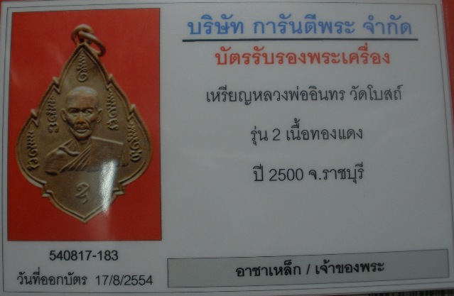 | ชื่อพระเครื่อง | @@@...เหรียญหลวงพ่ออินทร์ วัดโบสถ์ จ.ราชบุรี รุ่น 2 เนื้อทองแดง ปี 2500 สภาพสวย ผิวเดิมๆๆ มาพร้อมบัตรรับรองครับ...@@@ |
