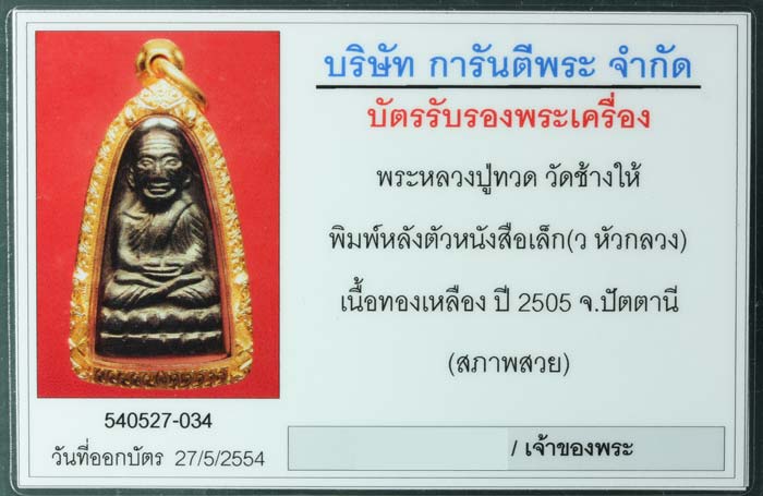 หลวงปู่ทวดพิมพ์หลังหนังสือพิมพ์เล็ก ปี2505 พิมพ์วอหัวกลวง สภาพสวนมาก ผิวเดิมสุดๆ ผิวปรอทแห้งแก๊ก บัตรระบุ สภาพสวย