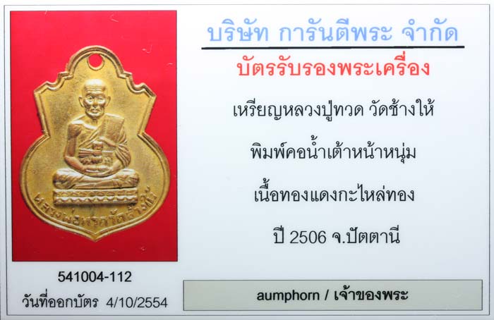 เหรียญหลวงปู่ทวด พิมพ์น้ำเต้าหน้าหนุ่ม เนื้อทองแดงกัไหล่ทอง หายากมากๆครับ พระพิมพ์นี้ที่แท้ๆกะไหล่ทองเดิม องค์นี้ติดที่3 งานพันทิพ วันที่ 11-09-2554 และมีบัตรรับรองเรียบร้อยแล้ว ยืนยันความแท้เดิม 100%