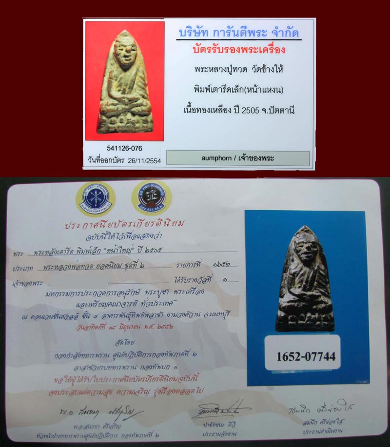 หลวงปู่ทวด หลังเตารีดเล็ก ปี2505 พิมพ์หน้าแหงน สวย องค์ประกอบครบ 5 อย่าง...1.พิมพ์...2.เนื้อ...3รอยตะไบ...4.ดินเบ้า...และ5.ยาดำ ครบสูตร...แช้มป์งานพันทิพย์ 14 มิ.ย.2552 พร้อมบัตรรับรอง และแท้ทุกสถาบัน