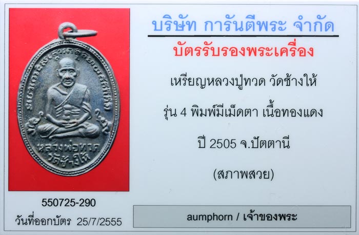 บัตรสวย...เหรียญหลวงปู่ทวด รุ่น4 มีเม็ดตา