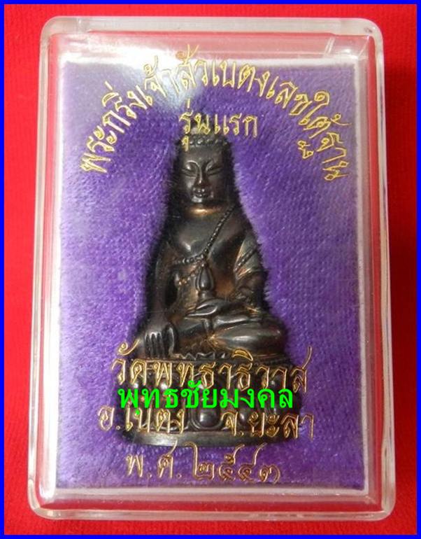 พระกริ่งเจ้าสัวเบตง รุ่นแรก หมายเลข 192 เนื้อนวะโลหะผสมแก่ทองคำกลับดำสนิท ปี43 วัดพุทธาธิวาส จ.ยะลา***เนื้อนวะสร้างแค่ 999 องค์เท่านั้นอีกหน่อยหายากสุดๆครับ เป็นพระกริ่งที่สวยงามคมชัดรวมทั้งมีพุทธลักษณะที่สง่างามผึ่งผายอลังการอันเกิดจากฝีมือการสร้างสรรค์ของช่างพิศาล วนิชชัยอาภรณ์ สำหรับชนวนศักดิ์สิทธิ์ที่นำมาจัดสร้างก็ล้วนแต่เป็นชนวนพระกริ่งชื่อดังมากมายหลายสำนักรวมทั้งแผ่นยันต์หลายร้อยแผ่นของพระคณาจารย์ทั่วประเทศและที่ขาดไม่ได้คือแผ่นยันต์ 108 นะ 14 นะ ตามตำรับการสร้างพระกริ่ง นอกจากนี้ พล.ต.ต.ขุนพันธ์รักษ์ราชเดช ยังได้มอบโลหะชนวนศํกสิทธิ์หลายรายการให้ด้วยอาทิ โลหะจากยอดพระบรมธาตุนครศรีธรรมราช ชนวนพระกริ่ง ภ.ป.ร. วัดบวรฯ ชนวนเก่าของวัดเขาอ้อ ชนวนเก่าวัดดอนศาลา ชนวนกริ่งภูทราวดีชนวนพระกริ่งวัดราชาธิวาส ชนวนพระปิดตาวัดแหลมทราย ชนวนพระกริ่งพุทธศิหิงค์ ปี 17 และปี 37 ชนวนพระพิจิตร พระสุพรรณบุรี พระกำแพงเพชรที่ชำรุด และ พระกริ่งเนื้อนวโลหะพิเศษ ทั้งหมดผสมด้วยทองคำน้ำหนัก 200 บาท เพื่อให้เนื้อหากลับดำสนิทเงางาม พิธีพุทธภิเษกครั้งแรก ณ วิหารหลวงวัดพระมหาธาตุวรวิหาร จ.นครศรีธรรมราช เกจิที่เข้าร่วมพิธีธรรม 4 รูป จากวัดมหาธาตุวรวิหาร พระเกจิอาจารย์สายนครศรีฯ และสายเขาอ้อ อาทิ ท่านวัน วัดเสาธงทองท่านพระครูกาชาด วัดดอนศาลา พ่อท่านกลั่น วัดเขาอ้อ พ่อท่านคล้าย วัดภูเขาทอง พ่อท่านพรหม วัดบ้านสวน ฯลฯนั่งปรกปลุกเสก และขณะเดียวกัน พล.ต.ต.ขุนพันธ์รักษ์ราชเดช ร่วมประจุ พุทธาคมตลอดพิธี พ่อท่านวัน วัดเสาธงทอง ดับเทียนชัย พล.ต.ต.ขุนพันธ์รักษ์ราชเดช และผู้ร่วมในพิธีทำพิธีเบิกแว่นเทียนสมโภชน์ พิธีพุทธภิเษกครั้งที่สอง ณ พระอุโบสถ วัดพทธาธิวาส อ.เบตง จ.ยะลา เกจิที่เข้าร่วมพิธี พ่อท่านแดง วัดโคกทราย พ่อท่านสิงห์ วัดลำพะยา พ่อท่านเขียว วัดห้วยเงาะ พ่อท่านแดงวัดบุรพารามพ่อท่านเรวัต (โต๊ะถือปะ) วัดใหม่พิกุลทอง พ่อท่านคล้าย วัดกิโล 7 พ่อท่านพล วัดนาประดู่ ทำพิธีนั่งปรุกเสกจัดได้ว่าเป็น วัตถุมงคลอีกชุดหนึ่งสายขุนพันฯ ที่เข้มขลังทั้งพิธี และ มวลสารในการสร้างครับ เสียดายที่ของมีจำนวนน้อย และ เสร็จพิธี ชาว singapore ยังนิมนต์กลับบ้านไปหลายชุด ครับ ของจึงไม่ค่อยมีหมุนเวียนในตลาดซักเท่าไรครับ จำนวนวัตถุมงคลที่สร้าง -พระกริ่งเจ้าสัวเบตง รุ่นแรกเลขใต้ฐาน เนื้อทองคำ นน. 60 กรัม สร้าง 43 องค์ -พระกริ่งเจ้าสัวเบตง รุ่นแรกเลขใต้ฐาน เนื้อทองคำ นน. 60 กรัม กรรมการ สร้าง 20 องค์ -พระกริ่งเจ้าสัวเบตง รุ่นแรกเลขใต้ฐาน เนื้อนวะโลหะผสมแก่ทอง