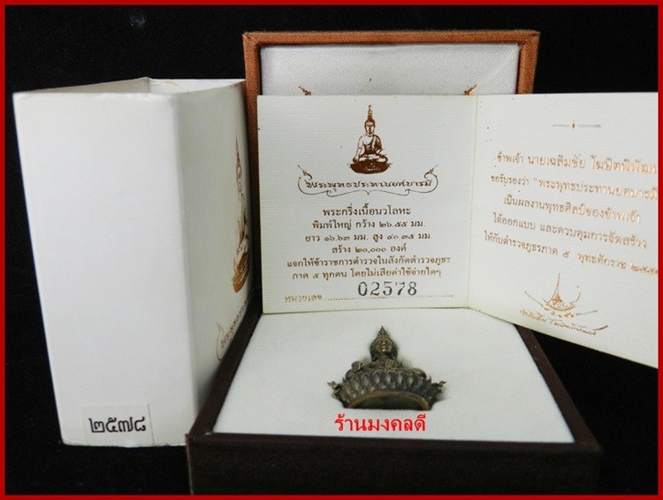 พระกริ่งพุทธประทานยศบารมี เนื้อนวะโลหะ (โค๊ดเงิน)ผิวออกเหลือง พิมพ์ใหญ่หน้าตัก 2 ซม สูงประมาณ 4 ซม. เนื้อนี้สร้างจำนวน 20000 องค์ เพื่อแจกตำรวจ พิธีพุทธาภิเษกอันยิ่งใหญ่ ณ. สถานที่ศักดิ์สิทธิ์ทางภาคเหนือ 9 วาระดังนี้ 1.ในวันพุธ ที่ ๑๙ สิงหาคม ๒๕๕๒ เวลา ๐๙.๓๗ น. ณ วัดพระธาตุดอยสุเทพราชวรวิหาร จังหวัดเชียงใหม่ 2.ในวันพฤหัสบดี ที่ ๒๐ สิงหาคม ๒๕๕๒ เวลา ๑๒.๕๙ น. ณ วัดพระธาตุหริภุญชัยวรมหาวิหาร จังหวัดลำพูน 3.ในวันศุกร์ ที่ ๒๑ สิงหาคม ๒๕๕๒ เวลา ๐๙.๓๙ น. ณ วัดพระแก้วดอนเต้าสุชาดาราม จังหวัดลำปาง 4.ในวันเสาร์ ที่ ๒๒ สิงหาคม ๒๕๕๒ เวลา ๐๙.๓๙ น. ณ วัดพระธาตุช่อแฮ จังหวัดแพร่ 5.ในวันอาทิตย์ ที่ ๒๓ สิงหาคม ๒๕๕๒ เวลา ๐๙.๓๙ น. ณ วัดภูมินทร์ จังหวัดน่า 6.ในวันจันทร์ ที่ ๒๔ สิงหาคม ๒๕๕๒ เวลา ๐๙.๓๙ น. ณ วัดศรีโคมคำ จังหวัดพะเยา 7.ในวันอังคาร ที่ ๒๕ สิงหาคม ๒๕๕๒ เวลา ๐๙.๓๙ น. ณ วัดพระแก้ว 0จังหวัดเชียงราย 8.ในวันพฤหัสบดี ที่ ๒๗ สิงหาคม ๒๕๕๒ เวลา ๐๙.๓๙ น. ณ วัดพระธาตุดอยกองมู จังหวัดแม่ฮ่องสอน 9.พิธีเบิกเนตรมหาพุทธาภิเษก วันเสาร์ ที่ ๕ กันยายน ๒๕๕๒ ณ ตำรวจภูธรภาค ๕ พระพุทธประทายยศบารมี ออกแบบและควบคุมโดย อ.เฉลิมชัย โฆษิตพิพัฒน์ ศิลปินแห่งชาติ ** ***องค์นี้หมายเลขสวย 2578 (พิเศษโค๊ดเงิน มีจำนวนไม่ถึง 1000 องค์ ) ผิวออกเหลือง ซุ้มแหลมทุกอันสมบูรณ์ กริ่งดังกังวาล อุปกรณ์ครบ กล่องนอกขาว+กล่องใน+ใบเซอร์พระประจำองค์ ควรค่าแก่การเก็บสะสมและบูชา ลองชมดูครับ ***พุทธศิลป์สวยงามเกินคำบรรยายจริงๆ ช่วงนี้ในพื้นที่และต่างพื้นที่หายากจริงๆกว่าจะได้มาแต่ละองค์***