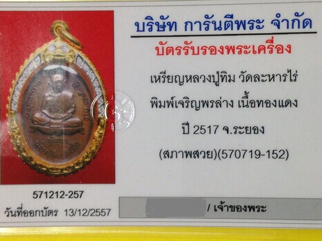 เหรียญเจริญพรล่างหลวงปู่ทิม บัตรสภาพสวยมาก