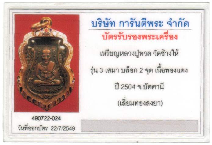 เหรียญสภาพสวยพร้อมเลี่ยมทอง มีบัตรรับรอง สภาพแบบนี้หายากแล้วครับ