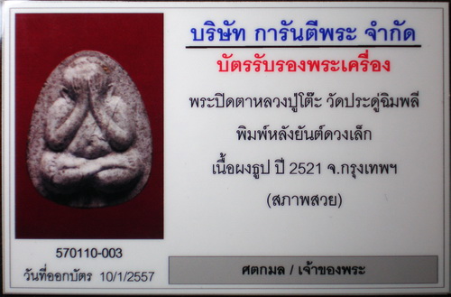 พระปิดตายันต์ดวงเล็ก หลวงปู่โต๊ะปลุกเสก 3 ไตรมาส ( เนื้อผงธูปฯสร้างน้อยมาก น้อยกว่าเนื้อใบลานถึง 26 เท่า เห็นนิ้วมือครบทั้ง 10 นิ้ว /เม็ดพระศกชัด พระผิวเดิม100%หายากมากสภาพนี้ ไม่มีปริลาน) **พระปิดตายันต์ดวงเล็ก เป็นพระที่มีขนาดเล็กองค์พระกว้างประมาณ 1.8 ซม. สูง 2.3 ซม. แต่แกะแม่พิมพ์ได้อย่างงดงาม โดยย่อส่วนลงมาจากพระปิดตาจัมโบ้ 2 หลวงปู่เมตตาปลุกเสกให้ถึง 3 ไตรมาส ปี 2521-2523 วาระเดียวกันกับพระปิดตาปลดหนี้ และพระปิดตาจัมโบ้ 2 เรื่องพุทธคุณจึงไม่แตกต่างกัน ที่สำคัญจำนวนสร้างน้อยมากเพียง 2,000 องค์ สร้างน้อยกว่าเนื้อผงใบลานถึง 26 เท่า ( เนื้อผงใบลานสร้างประมาณ 5 หมื่นกว่าองค์ ) และพบเห็นองค์ที่สวยได้ยาก เนื่องจากเนื้อผงธูปฯมักจะแตกราน ส่วนใหญ่จะกดพิมพ์ได้ไม่สวย ( ขนาดองค์พระกว้างประมาณ 1.8 ซม. สูง 2.3 ซม. ) ...........องค์ที่นำลงในชมรมเป็นเนื้อผงธูปกัมมัฏฐาน บรรจุตะกรุดเงิน 1 ดอก พระคัดมา สภาพสวยมากๆ เห็นเม็ดพระศกชัด นิ้วมือ นิ้วเท้าคมชัดทั้ง 10 นิ้ว กดพิมพ์ได้สวยคมมากๆ ปรากฎเส้นสายฝนตามพื้นผิว องค์พระกลมไม่บิดเบี้ยว ตัวหนังสือยันต์หลังคมชัดมาก มีเส้นเกศาที่ด้านหลัง ....กำไลข้อเท้าคมชัด ตะกรุดวางอยู่ในตำแหน่งที่สวย และไม่เป็นสนิมเขียว ส่วนใหญ่เนื้อผงธูปฯที่พบตามองค์พระจะปริลานมีรอยแยก แต่องค์นี้สภาพสวยมากจริงๆไม่มีรอยปริแยกแตกราน เก็บพระสวยเพียงองค์เดียวก็พอ***รับประกันพระสภาพสวยจริงเดิมผิวเดิม100% ไม่ผ่านการแขวนบูชา ไม่ช้ำมือจากการสัมผัส ไม่มีอุดซ่อม หรือไล้แต่งผิว