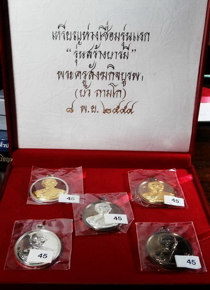 เหรียญห่วงเชื่อม (กรรมการ) รุ่นสร้างบารมี ครบชุด5เหรียญ หมายเลข 45 หลวงปู่บัว ถามโก วัดศรีบุรพาราม ปี 2554 จำนวนการสร้างเพียง 176 ชุด ............เหรียญที่นำลงในชมรมสภาพสวยมากทุกเหรียญ ผิวเดิม100% ตอก "กรรมการ" หมายเลข 45 (ผลรวมได้9) สร้างเพียง 176 ชุดเท่านั้น เหรียญทั้งชุดนี้อยู่ในซีลเดิมรักษาผิวไว้อย่างดี เหรียญผิวสวยไม่มีรอยดำ มีให้พร้อมกล่องเดิมสวยงาม มีให้พร้อมบัตรรับรองทุกเหรียญ