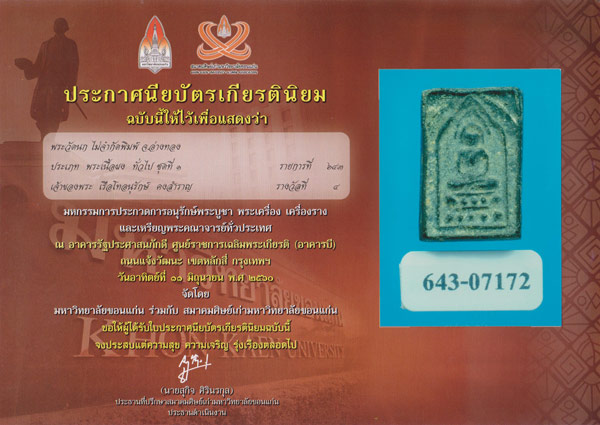 พิมพ์เล็ก ฐานบัว มีซุ้มประภามณฑล จ.อ่างทอง สภาพสวย รางวัลที่ 4 จัดโดยมหาวิทยาลัยขอนแก่นร่วมกับสมาคมศิกษ์เก่ามหาวิทยาลัยขอนแก่น วันที่ 11 มิ.ย. 60 ณ ศูนย์ราชการแจ้งวัฒนะ