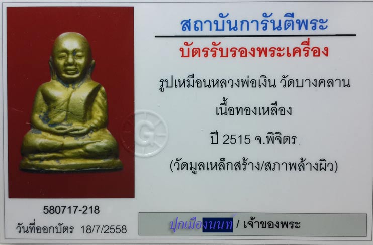 รูปหล่อหลวงพ่อเงิน วัดมูลเหล็ก พิธีสุดยิ่งใหญ่ปี2515 เนื้อทองเหลือง ตอกโค็ต + มาพร้อมใบรับรองพระแท้ G-PRA -------------------------------------------------- ปลุกเสกที่วัดหลวงพ่อเงิน เมื่อเสร็จพิธีปลุกเสกจากวัดสุทัศนฯ แล้ว ได้มีการนำพระหลวงพ่อเงินทั้งหมดกลับวัดบ้านเกิดของท่าน คือ วัดบางคลาน เพื่อทำพิธีปลุกเสกครั้งสุดท้าย เมื่อวันอาทิตย์ที่ ๒๐ มกราคม ๒๕๑๕ โดยได้นิมนต์พระคณาจารย์จากทั่วประเทศ ร่วมบริกรรมปลุกเสก ตามพิธีกรรมแบบโบราณตลอดทั้งคืน เริ่มตั้งแต่ ๔ โมงเย็น ไปจนถึง ๖ โมงเช้า โดยได้แบ่งพระคณาจารย์นั่งปรกปลุกเสกเป็นชุด ชุดละ ๑๖ รูป จำนวน ๖ ชุด รวม ๙๖ รูป โดยปลุกเสกชุดละ ๒ ชั่วโมง สลับกันไป อย่างไม่มีหยุดพัก มีทั้งนั่งปรก บริกรรมภาวนา สวดพระคาถามหาทิพย์มนต์ พระคาถาพุทธาภิเษก และพระคาถาภาณวาร เป็นต้น รายชื่อพระคณาจารย์นั่งปรกและบริกรรม 1.หลวงพ่อเงิน พระอินทรสมาจารย์ วัดอินทรวิหาร จังหวัดพระนคร 2.หลวงพ่อทอง พระครูวิริยะโสภิต วัดพระปรางค์ จังหวัดสิงห์บุรี 3.หลวงพ่อแพ พระครูศรีพรหมโสภิต วัดพิกุลทอง จังหวัดสิงห์บุรี 4.หลวงพ่อแจ่ม พระครูประกาศธรรมคุณ วัดวังแดง จังหวัดพระนครศรีอยุธยา 5.หลวงพ่อเทียม พระครูพิพิธวิหารการ วัดกษัตราธิราช จังหวัด พระนครศรีอยุธยา 6.หลวงพ่อเส่ง พระครูโสภณกัลยานุวัฒน์ วัดกัลยาณมิตร จังหวัดธนบุรี 7.หลวงพ่อเฮง พระครูกัลยาณานุกุล วัดกัลยาณมิตร จังหวัดธนบุรี 8.หลวงพ่อจันทร์ พระครูจันทโรภาส วัดป่าข่อย จังหวัดสุโขทัย 9.หลวงพ่อถม พระครูพิลาสธรรมคุณ วัดใหม่ธรรมปัญญาราม จังหวัดสุโขทัย 10.หลวงพ่อพวง พระครูโพธิคุณาธาร วัดไผ่ท่าโพธิ์ จังหวัด พิจิตร 11.หลวงพ่อเตียง พระครูพิพัฒน์ธรรมคุณ วัดเขารูปช้าง จังหวัดพิจิตร 12.หลวงพ่อทวี พระครูพิลาสธรรมกิตต์ วัดโรงช้าง จังหวัดพิจิตร 13.หลวงพ่อน้อม พระครูวิจิตรวุฒกร วัดท้ายน้ำ จังหวัดพิจิตร 14.หลวงพ่อเปรื่อง พระครูพิบูลธรรมเวท วัดหิรัญญาราม จังหวัดพิจิตร 15.หลวงพ่อสิงห์ดำ พระครูวิรุฬธรรมโกวิทย์ วัดเหมืองผาแม่ริม จังหวัดเชียงใหม่ 16.หลวงพ่อเมือง พระครูอุดมเวทวรคุณ วัดท่าแหน จังหวัดลำปาง 17.อาจารย์ธงไชย พระครูญานวิศิษฐ์ วัดพุทธมงคลนิมิต จังหวัดนครสวรรค์ 18.อาจารย์แก้ว พระครูรัตนานุรักษ์ วัดปงสนุกใต้ จังหวัดลำปาง 19.อาจารย์สิริ พระครูวิจารณ์ธรรมสิริ วัดบางมูลนาก จังหวัดพิจิตร 20.พระครูสังฆวิชิตกล่อม วัดเขาแก้ว จังหวัดนครสวรรค์ 21.พระครูนิภาธรโสภณ วัดอินทราราม จังหวัด นครสวรรค์ 22.พระครูศรีปริยานุรักษ์ วัดพันอัน จังหวัดเชียงใหม่ 23.พระครูมงคลคุณาธร วัดหม้อคำดวง จังหวัดเชียงใหม่ 24.หลวงพ่อผ่อง วัดจัก