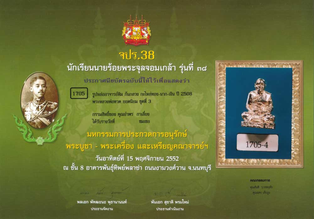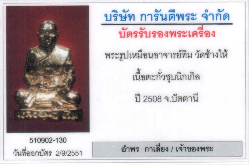 รูปหล่อก้นกลวง อาจารย์ทิม วัดช้างให้ เนื้อตะกั่ว กะไหล่นิเกิล สร้างปี 2508 สภาพสวยมาก มีบัตรรับรองของ G-pra ครับ สำหรับ กะไหล่นิเกิลจะนิยมน้อยกว่า กะไหล่นาค และกะไหล่ทอง รายการประกวดมักจะจัดอยู่ในหมวดเดียวกัน ยากครับที่จะเบียดติดอันดับ 1 ถึง 4 องค์นี้ทำได้แล้ว ได้ที่4 งานพันทิพ 15-11-2552