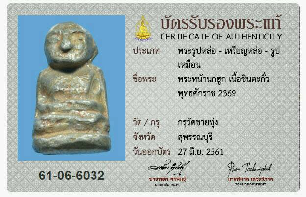 พระกรุหน้านกฮูก กรุชายทุ่ง จ.สุพรรณบุรี เนื้อชินตะกั่ว พระสภาพสวยสมบูรณ์ ติดที่ 1 งานใหญ่ศูนย์ราชการ พร้อมบัตรสมาคมพระเครื่องการันตีความแท้ และบัตรรับรองเพื่อนบ้าน
