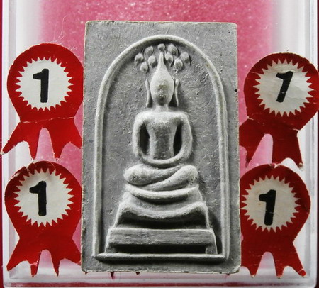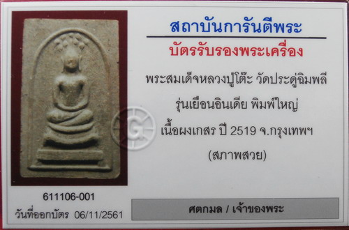พระสมเด็จปรกโพธิ์รุ่นเยือนอินเดียสร้างขึ้นหลังจากที่หลวงปู่ได้เดินทางกลับมาจากการเยือนประเทศอินเดีย ด้านหลังเป็นรูปเจดีย์ที่พุทธคยา เพื่อเป็นอนุสรณ์ว่า ครั้งหนึ่งหลวงปู่ได้เดินทางไปสักการะสังเวชนียสถานอันศักดิ์สิทธิ์แห่งนี้ ( ข้อมูลจากหนังสือคุณประสิทธิ์ ปริชาน ) สร้างขึ้นมีทั้งพิมพ์เล็ก และพิมพ์ใหญ่ ( พิมพ์ใหญ่ สร้างด้วยเนื้อผงเกสรจำนวน 8,667 องค์ เนื้อผงใบลานสร้างน้อย ) .........องค์ที่นำลงประมูลพระสภาพสวยผิวเดิมมากๆ กดพิมพ์ได้คมชัดมากๆ พระเกศงดงามถึงปลายยอด พระกรรณ(ใบหู)ชัดทั้ง 2 ข้าง ใบโพธิ์คมชัดมากๆ ซุ้มองค์พระเรียบร้อยดีมาก เจดีย์ด้านหลังคมชัด ไม่ผ่านการแขวนบูชา พระผิวเดิม มีแป้งโรยพิมพ์เดิม ผิวไม่เสียจากการสัมผัส องค์พระหนาครึ่งซม. พระกดพิมพ์ได้สวยมากคมชัดมากอย่างนี้หายากมากๆ นานๆจะพบสักครั้ง ****ติดรางวัลที่1 มาแล้วถึง 5งาน งานใหญ่ในกรุงเทพฯ 4 งาน งานจ.ลพบุรี 1 งาน มีให้พร้อมใบประกาศ *********รับประกันว่าพระสวยจริงผิวเดิม100% ไม่มีอุดซ่อม หรือแต่งผิว