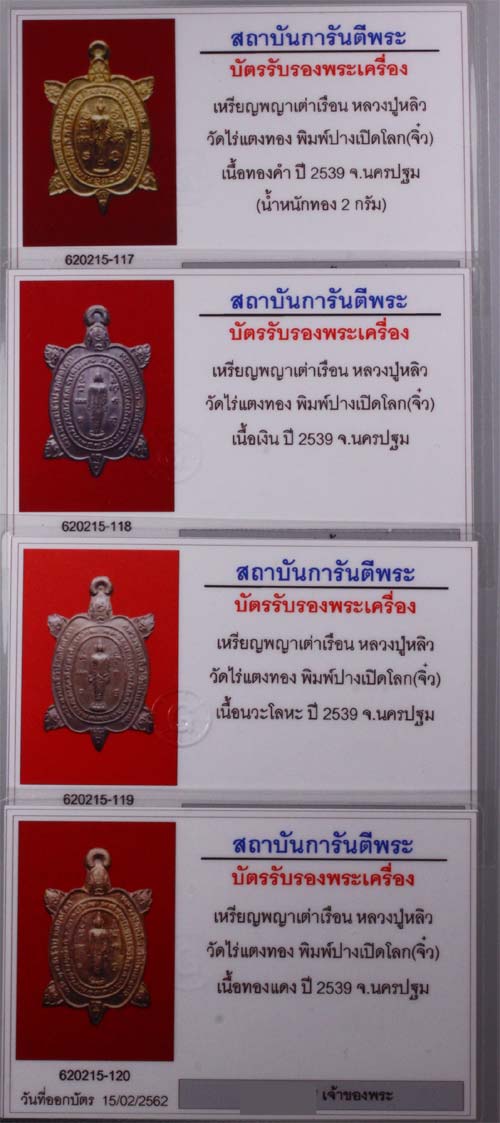 -ชุดทองคำ เหรียญพญาเต่าเรือนหลวงปู่หลิว พิมพ์ ปางเปิดโลก จิ๋ว เนื้อทองคำ ปี2539 (น้ำหนัก 2 กรัม) -เหรียญพญาเต่าเรือนหลวงปู่หลิว พิมพ์ ปางเปิดโลก จิ๋ว เนื้อเงิน ปี 2539 -เหรียญพญาเต่าเรือนหลวงปู่หลิว พิมพ์ ปางเปิดโลก จิ๋ว เนื้อนวะโลหะ ปี 2539 -เหรียญพญาเต่าเรือนหลวงปู่หลิว พิมพ์ ปางเปิดโลก จิ๋ว เนื้อทองแดง ปี 2539