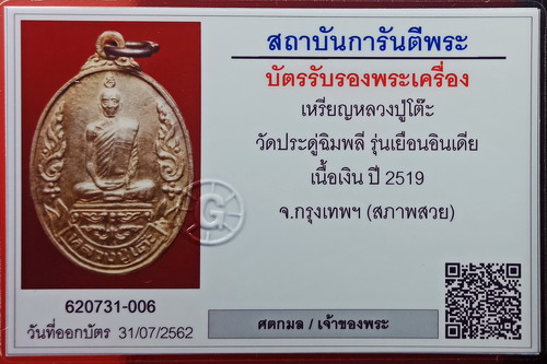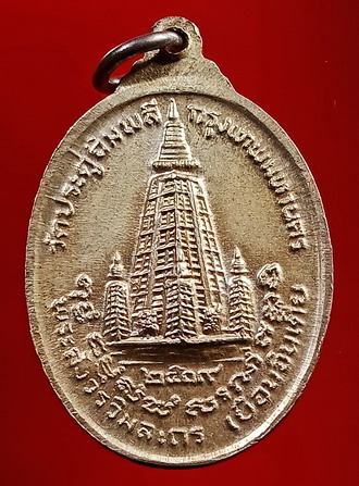 เป็นเหรียญที่ระลึกเนื่องในโอกาสที่หลวงปู่ได้เดินทางไปประเทศอินเดีย ด้านหลังเป็นรูปเจดีย์ที่พุทธคยา เพื่อเป็นอนุสรณ์ว่า ครั้งหนึ่งหลวงปู่ได้เดินทางไปสักการะสังเวชนียสถานอันศักดิ์สิทธิ์แห่งนี้ ***เหรียญเยือนอินเดียเนื้อเงิน แบ่งออกเป็น2บล็อก บล็อกที่ 1.พบเห็นกันมากที่สุดคือบล็อกพื้นผิวไม่เรียบ ตามพื้นผิวจะมีเส้นจากการแกะแม่พิมพ์ให้เห็นจำนวนมากไข้วกันไปมาอย่างชัดเจน ซึ่งพบมากในเนื้อทองคำบางคนจึงเข้าใจว่าเป็นบล็อกทองคำ ซึ่งเป็นความเข้าใจที่ผิดเนื่องจากเนื้อทองคำจะกระจายบล็อกปั๊มทุกบล็อก ส่วนด้านหลังมีรอยจมคล้ายปีกกาหน้าตัวหนังสือแถวล่างบ้าง ไม่มีบ้าง เพราะด้านหลังเองก็มีหลายบล็อก ( แยก "เก๊-แท้" จึงต้องดูจากรอยตัดขอบเหรียญ ) บล็อกที่ 2. เป็นบล็อกพื้นผิวตึงขึ้นมา แต่จะมีเส้นคล้ายเม็ดฝนตกลงมาเป็นแถวเป็นแนวยาวในแนวดิ่งตามพื้นเหรียญ และด้านหลังจะมีรอยจมคล้ายปีกกาหน้าตัวหนังสือแถวล่าง พบบล็อกนี้ใช้ปั๊มมากที่สุดคือเนื้อนาก เนื้อทองคำพบเห็นน้อย (ส่วนอีกบล็อกที่พบมากในเนื้อทองแดง เนื้อเงิน"จะไม่มี" คือบล็อกพื้นผิวเรียบมีเส้นแตกเข่าด้านขวามือเราวิ่งไปหาดอกจันด้านที่ตอกโค้ด บล็อกนี้พบมากในเนื้อทองแดงรมดำ และนวโลหะ)................. เหรียญที่นำลงในชมรมเป็นเหรียญเนื้อเงิน สภาพสวย ใบหน้าหลวงปู่ชัด เห็นดวงตาชัด จมูกโด่งมากๆ ริมฝีปากชัดเจน ไม่มีรอยขูดขีดตามใบหน้าของหลวงปู่ สร้างเพียง 1,000 เหรียญ
