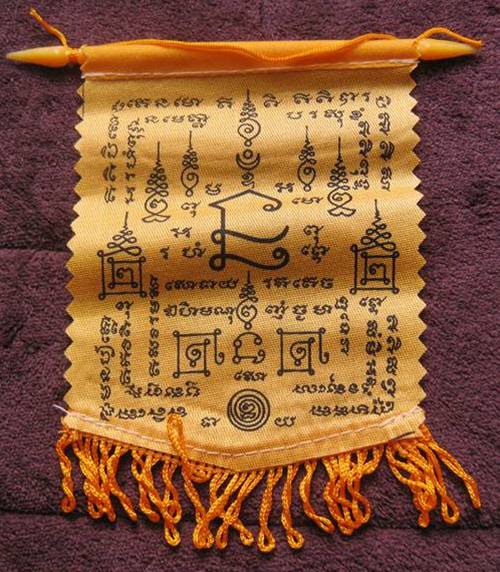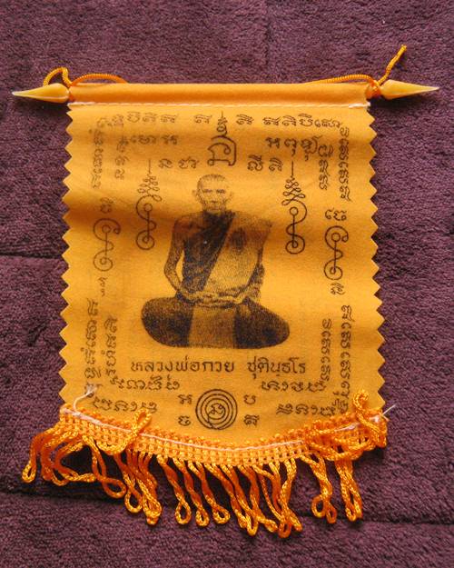 ธงห้อยหน้ารถรูปหลวงพ่อกวยหลวงปู่หมุน ปลุกเสก พิธีมหาสมปรารถนา วัดซับลำใย สร้าง 2543