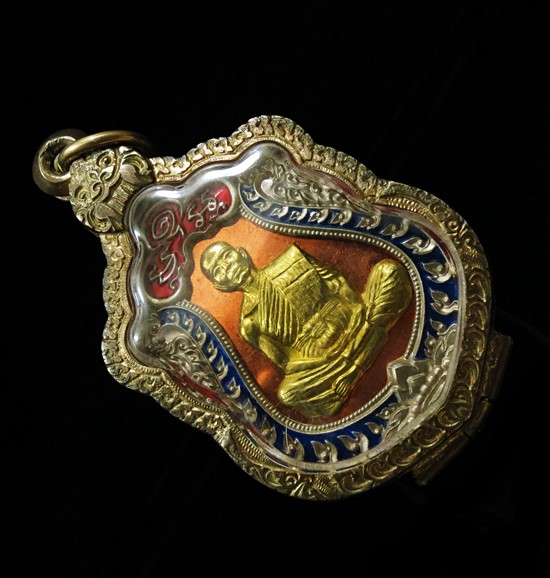 เหรียญปะฉลุ 3 ชิ้น ลงยาสองสี เนื้อทองแดง ขอบอัลปาก้า องค์ปอกลูกปืน เลข 72
