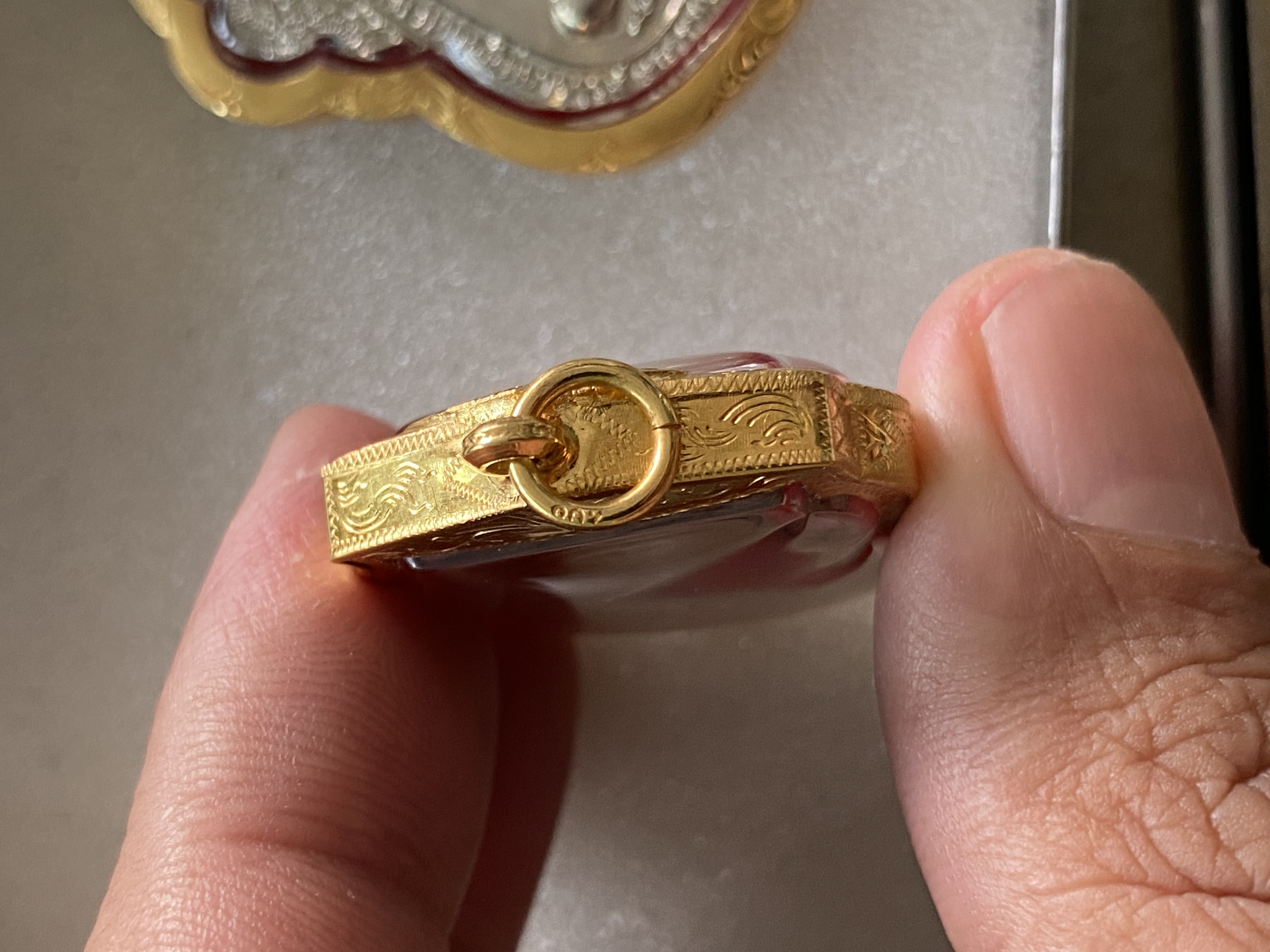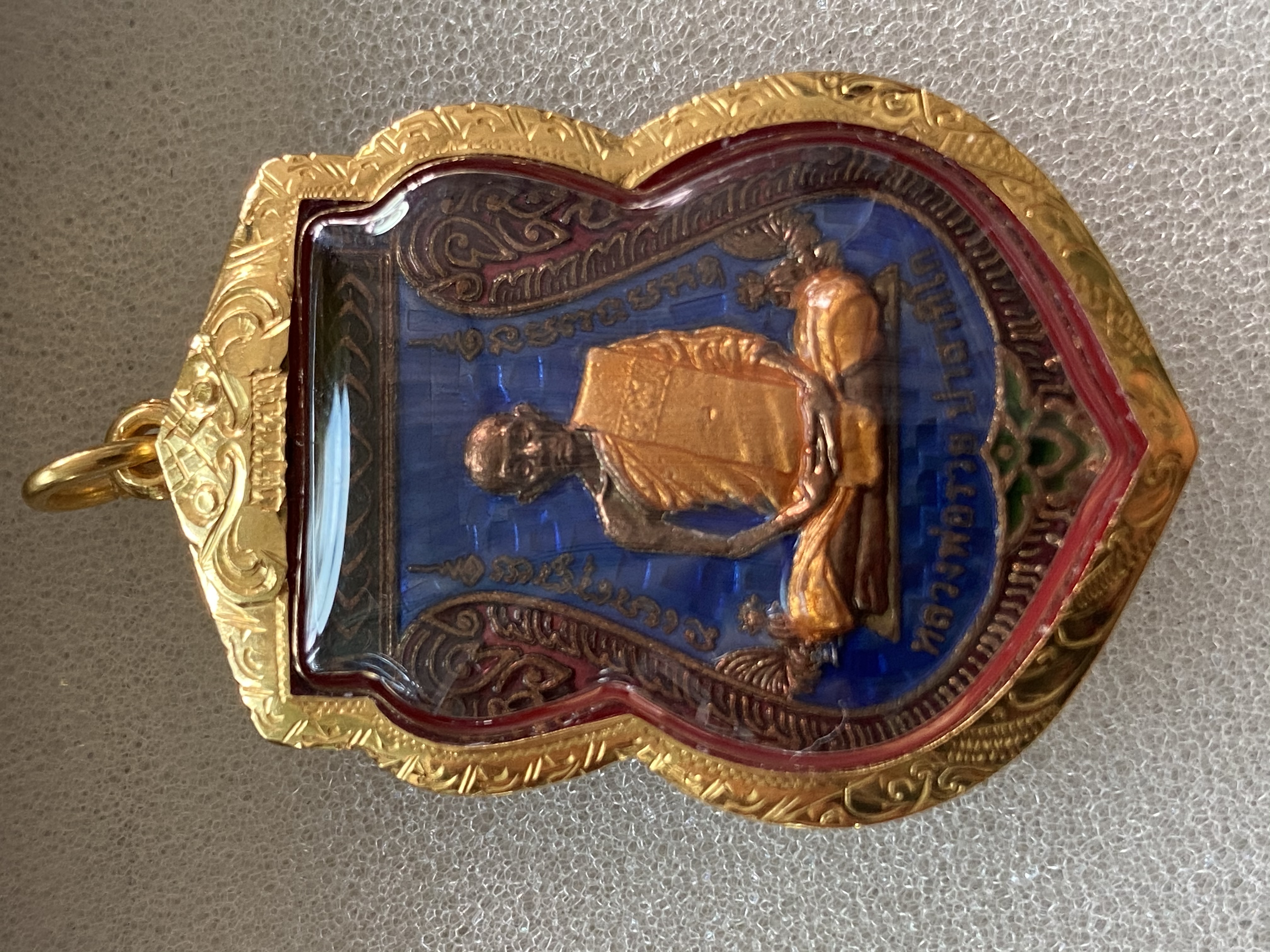 เหรียญเลื่อนสมณศักดิ์ ลงยาน้ำเงิน หลวงพ่อรวย วัดตะโก อยุธยา เลี่ยมทองแท้ยกซุ้มหัวสิงห์
