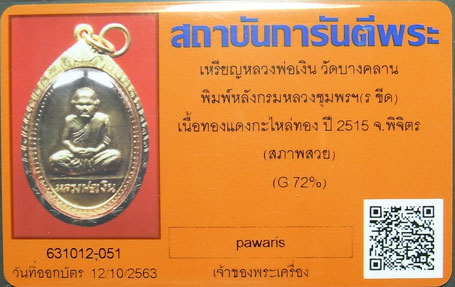 บัตรสภาพสวย เหรียญหลวงพ่อเงิน หลังกรมหลวงชุมพรฯ(นิ