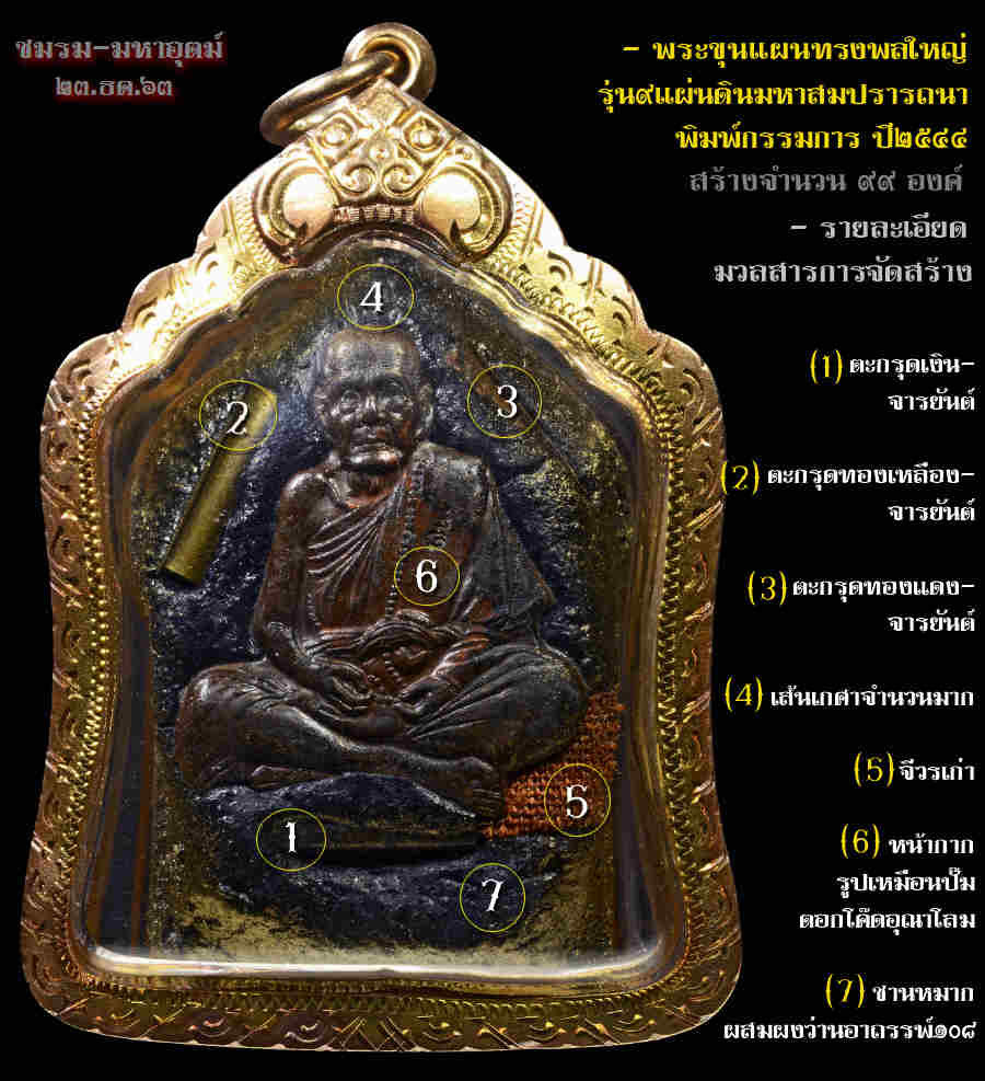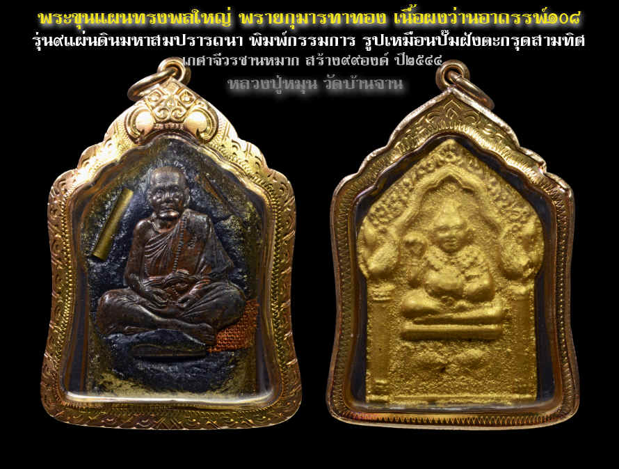 - พระขุนแผนทรงพลใหญ่ พรายกุมารทาทอง เนื้อผงว่านอาถรรพ์๑๐๘ รุ่น๙แผ่นดินมหาสมปรารถนา พิมพ์กรรมการ รูปเหมือนปั๊มฝังตะกรุดสามทิศ เกศาจีวรชานหมาก สร้าง๙๙องค์ ปี๒๕๔๔ เลี่ยมทอง - รายละเอียด มวลสารการจัดสร้าง ( 1 ) ตะกรุดเงิน-จารยันต์ ( 2 ) ตะกรุดทองเหลือง-จารยันต์ ( 3 ) ตะกรุดทองแดง-จารยันต์ ( 4 ) เส้นเกศาจำนวนมาก ( 5 ) จีวรเก่า ( 6 ) หน้ากากรูปเหมือนปั๊ม ตอกโค๊ดอุณาโลม ( 7 ) ชานหมาก ผสมผงว่านอาถรรพ์๑๐๘ #บารมีพระชุด "รุ่นมหาสมปรารถนา" ปี๒๕๔๓ และ "รุ่น๙แผ่นดินมหาสมปรารถนา" ปี๒๕๔๔ จัดสร้างโดย พระอาจารย์ตั้ว วัดซับลำใย ศิษย์สองครู ศิษย์เอกของ หลวงพ่อกวย วัดบ้านแค ผงมวลสารส่วนใหญ่ตกทอดมาจากหลวงพ่อกวย ในส่วนของเกศาจีวรชานหมากเป็นของ หลวงปู่หมุน วัดบ้านจาน รวมถึงการปลุกเสก