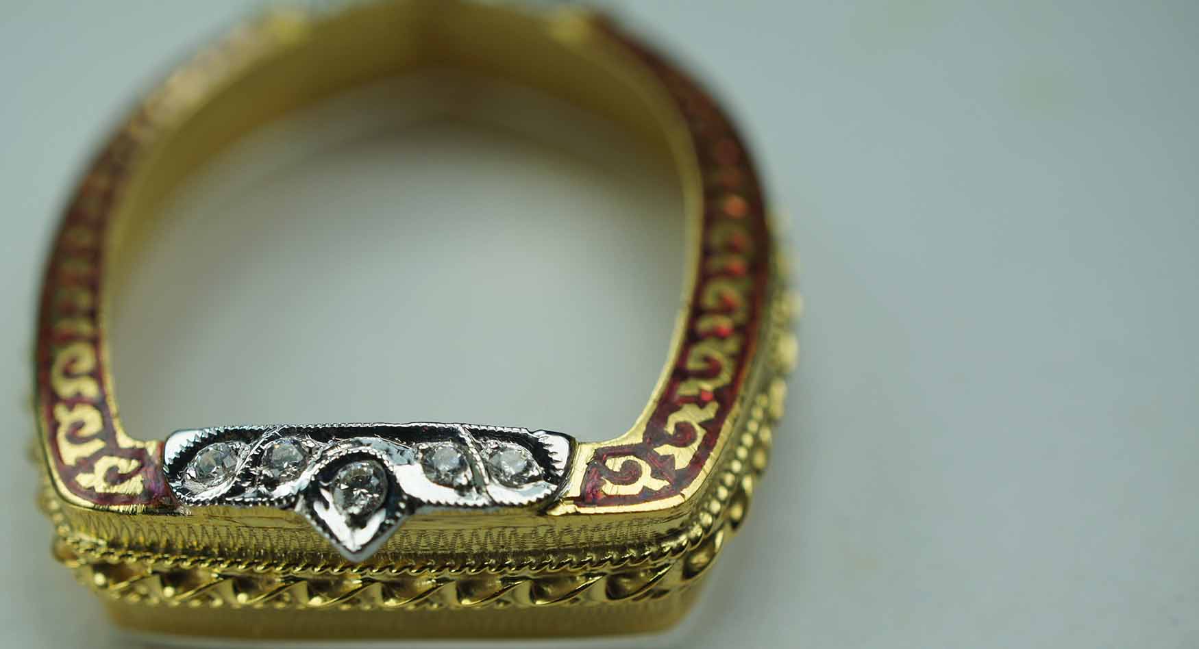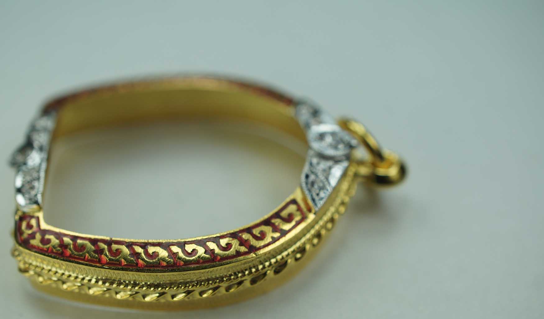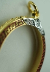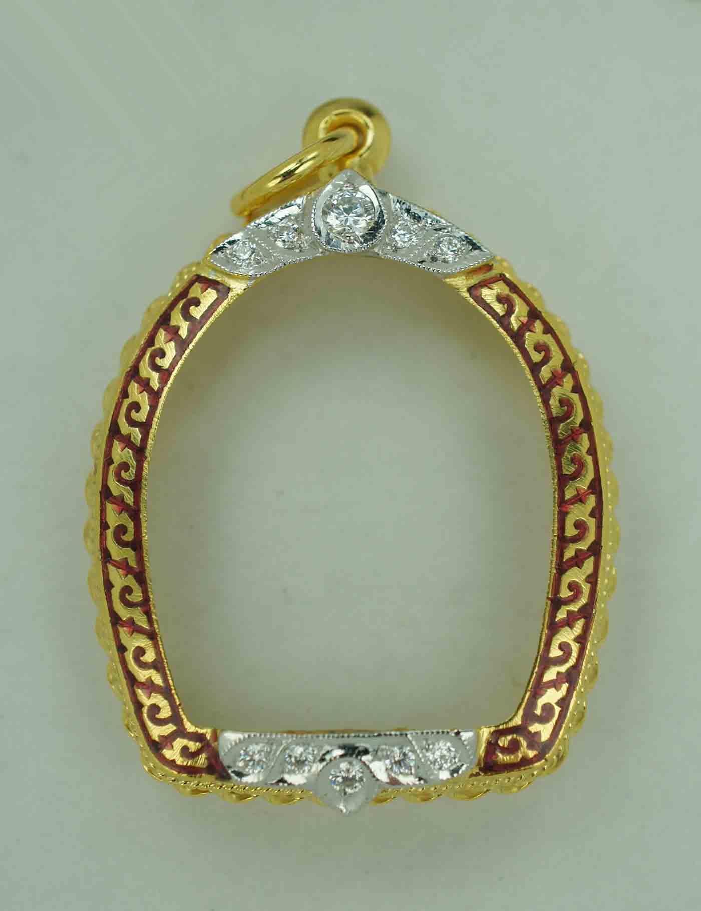 กรอบทอง ล้อมเพชร ลงยาแดง ข้างเกลียวโปเต้ 3 เส้น **
