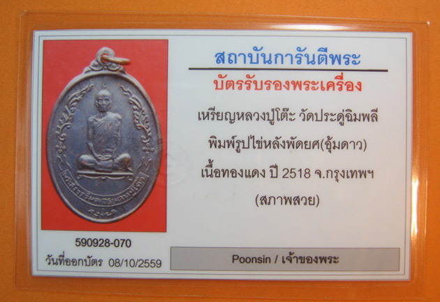 เหรียญรูปไข่ หลังพัดยศ( บล็อกนิยม...อุ้มดาว) เนื้อทองแดง หลวงปู่โต๊ะ วัดประดู่ฉิมพลี ปี 2518 บัตรสภาพสวย พร้อมเลี่ยมทอง