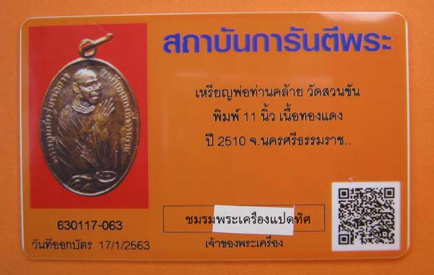 เหรียญพ่อท่านคล้าย พิมพ์ไหว้ข้าง 11นิ้ว นิยม(หลังยันต์เล็ก) เนื้อทองแดง วัดสวนขัน ปี 2510 สวยมากเดิมๆ เหรียญรุ่นนี้เขาว่า มีประสบการณ์เด่นมากทางเมตตามหานิยมและแคล้วคลาด เหรียญไหว้ข้าง 11 นิ้ว ปลุกเสกโดยพ่อท่านคล้าย วาจาสิทธิ์ ณ วัดสวนขัน ซึ่งเป็นพิธีใหญ่ของปี 2510 วัตถุประสงค์ในการสร้างเหรียญรุ่นนี้ คือ เพื่อหารายได้ไปบูรณะวัดคีรีกันทราวาส อ.ลานสกา และก่อนที่จะแจกจ่ายให้กับประชาชนทั่วไป พ่อท่านคล้าย ร่วมกับเกจิยุคนั้น ได้ร่วมกันปลุกเสกอีกครั้ง ณ วัดคีรีกันฯ ครับ