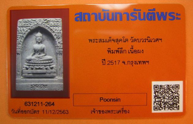 องค์นี้สภาพองค์พระสวยมาก พระสมเด็จสุคโต วัดบวรปี2517 พิมพ์ใหญ่ลึกนิยม พระสมเด็จสุคโต ของพระญาณสังวร สมเด็จพระสังฆราชสกลมหาสังฆปรินายก วัดบวรนิเวศวิหาร จัดสร้างเป็นที่ระลึก เนื่องในวโรกาสที่พระบาทสมเด็จพระเจ้าอยู่ได้เสด็จพระราชดำเนินมาทรงยกนพปฎล พระมหาเศวตฉัตรที่เปลี่ยนใหม่ถวายพระพุทธชินสีห์ เมื่อวันที่ 5 กรกฎาคม พ.ศ. 2517 พระสมเด็จสุคโต เป็นพระสมเด็จ ที่มีการจัดสร้างอย่างครบถ้วนตามโบราณ ประเพณี เจตนาการสร้างบริสุทธิ์ องค์พระ จัดสร้างโดยมวลสารมงคลที่สำคัญมากมาย อาทิ นพปฎลมหาเศวตฉัตร พระศกพระพุทธสุวรรณเขต พระโคนสมอ พระสมเด็จวังหน้า พระปิลันท์ วัดระฆังพิมพ์ต่างๆ ที่ชำรุดแตกหัก พระกรุที่ชำรุด ได้แก่ พระนางพญา พระรอดมหาวัน พระผงสุพรรณ พระซุ้มกอ เส้นพระเกศาสมเด็จพระมหาสมณเจ้ากรมพระยาปวเรศวริยาลงกรณ์ สมเด็จพระมหาสมณเจ้ากรมพระยาวชิรญาณวโรรส สมเด็จพระสังฆราชเจ้ากรมหลวงวชิรญาณวงศ์ และเส้นเกศาของพระอาจารย์ฝั้น อาจาโร เป็นต้น จึงทำให้วงการขนานพระนาม พระชุดนี้ว่าพระ 3 สมเด็จเนื่องจาก เป็นพระที่ผสมผงพระปิลันท์ ซึ่ง ประกอบด้วยผงสมเด็จโต และสมเด็จปิลันท์ ประกอบกับสร้างโดย สมเด็จพระสังฆราชฯ องค์ปัจจุบันของช่วงเวลานั้น ในครั้งนั้น คณะกรรมการวัดบวรนิเวศวิหารได้ดำเนินการจัดสร้างพระสมเด็จสุคโต โดยประกอบพิธีมหาพุทธาภิเษกในพระอุโบสถวัดบวรนิเวศวิหาร โดยสมเด็จพระสังฆราชฯ ทรงเป็นองค์ประธานฯ ในพิธีดังกล่าว มีการอาราธนาพระเถระคามวาสี และพระเถระอรัญวาสีที่ทรงกิติตคุณในทางพระกรรมฐาน 1.หลวงปู่โต๊ะ วัดประดู่ฉิมพลี 2.พระอาจารย์ฝั้น วัดป่าอุทุมสมพร 3.หลวงพ่อเกษม สุสานไตรลักษณ์ 4.หลวงปู่แหวน วัดแม่ปั๋ง เชียงใหม่ 5.หลวงปู่สิม วัดถ้ำผาปล่อง 6.หลวงพ่อฤาษีลิงดำ วัดท่าซุง 7.หลวงปู่ทิม วัดระหารไร่ 8.หลวงพ่อขาว วัดกลองเพล 9.หลวงพ่อเงิน วัดดอนยายหอม 10.หลวงปู่เพิ่ม วัดกลางบางแก้ว 11.หลวงพ่อเนื่อง วัดจุฬามณี 12.หลวงปู่ทิม วัดพระขาว 13.หลวงพ่อสุด วัดกาหลง 14.หลวงพ่อสงฆ์ วัดศาลาลอย 15.หลวงปู่สี วัดถ้ำเขาบุญนาค 16.หลวงปู่ดู่ วัดสะแก 17.หลวงพ่อมุ่ย วัดดอนไร่ 18.หลวงพ่อมุม วัดปราสาทเยอร์ 19.หลวงพ่อทบ วัดชนแดน 20.หลวงพ่อคูณ วัดบ้านไร่ 21.หลวงพ่อมี วัดมารวิชัย 22.ครูบาชุ่ม วัดวังมุ่ย 23.หลวงพ่อกวย วัดโฆสิตาราม 24.หลวงปู่ดุลย์ วัดบูรพาราม 25.หลวงปู่หลิว วัดไร่แตงทอง 26.หลวงพ่อผาง วัดอุดมคงคาครีรีเขตต์ 27.หลวงพ่อแพ วัดพิกุลทอง 28.หลวงปู่ตื้อ อจลธมฺโม วัดป่าอรัญญวิเวก 29.หลวงพ่อนารถ วัดศรีโลหะ 30.หลวงพ่อนำ วัดดอนศาลา 31.หลวงพ่อคลิ้ง วัดถลุงทอง 32.หลวงพ่อเขียว วัดทรง
