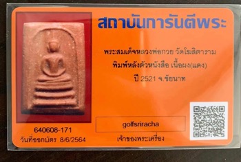 | พระสมเด็จหลังตัวหนังสือ (สมเด็จแดง) หลวงพ่อกวย ชุตินฺธโร วัดโฆสิตาราม ปี 2521 จัดสร้างออกงานผูกพัทธสีมาฝังลูกนิมิต วัดบ้านแค เป็นพระพิมพ์มาตรฐานสากล ออกพร้อมเหรียญรุ่นสาม (หลังยันต์,หลังหนุมาน,แจกแม่ครัว) ลักษณะเนื้อพระเป็นผงน้ำมัน ผสมมวลสาร อาทิ มวลสารแร่อุกาบาต เศษตะไบทอง และผงเก่าสมเด็จวัดระฆัง พุทธคุณ โดดเด่นด้านเมตตามหานิยม ค้าขาย โชคลาภ หน้าที่การงาน |
