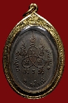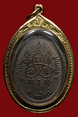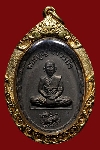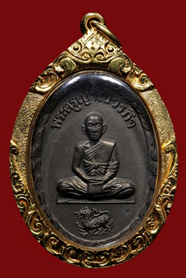 เหรียญนั่งสิงห์รุ่นแรกปี๑๙ เนื้อทองแดงรมดำ ประคตเม็ดใหญ่มือติดชัดจมูกโด่ง พระสวยมาก เลี่ยมทองพร้อมใช้