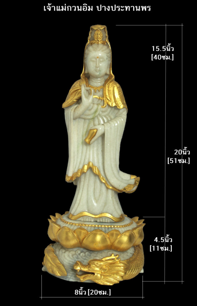 - พระโพธิสัตว์กวนอิม ปางประทานพร ยืนบนดอกบัวล้อมด้วยมังกรทอง งานแกะสลัก เนื้อหยกเกรดดีมาก