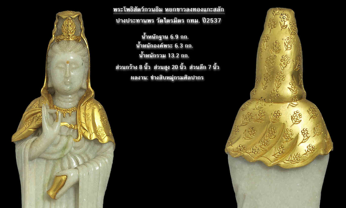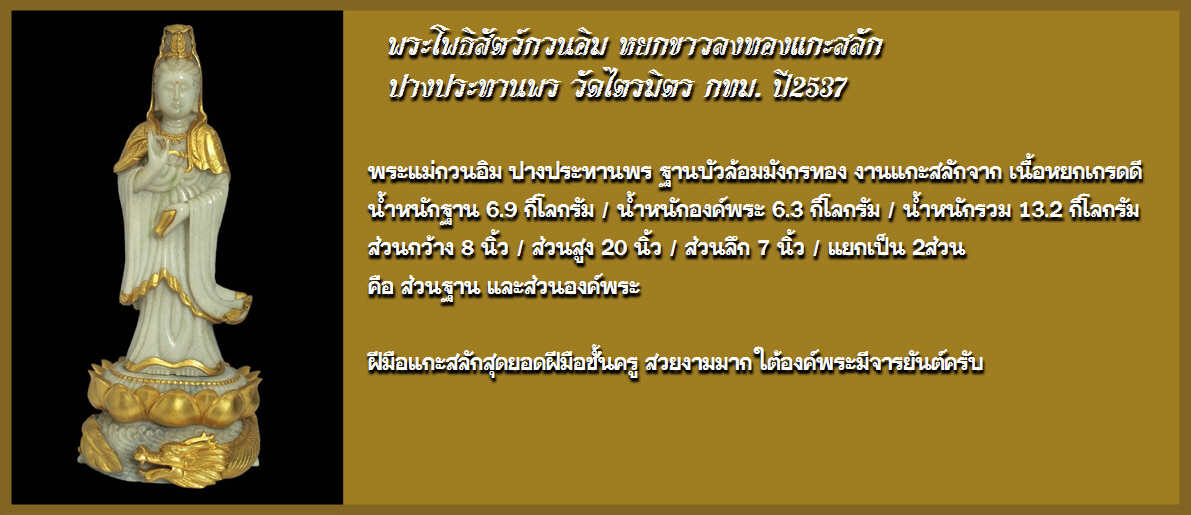 เจ้าแม่กวนอิม ปางประทานพร ท่านเจ้าคุณธงชัย วัดไตรมิตร กทม. เนื้อหยกขาวลงทองแกะสลัก ปี2537 สภาพสวยแชมป์!