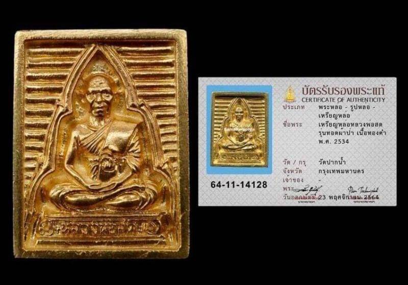 เหรียญทองคำหลวงพ่อสดวัดปากน้ำ ปี2534 พระทองคำ16.9กรัม เหรียนทองคำหลวงพ่อสดวัดปากน้ำ รุ่นทอดผ้าป่า พ.ศ.2534 ด้านหลังเป็นรูปยันต์ดวง หายาก เหมาะสำหรับลูกศิษย์ท่านครับ -พระผงของขวัญ หลวงพ่อสด วัดปากน้ำ หรือ พระวัดปากนํ้า ถือว่าเป็นพระผงที่มีอายุน้อยที่สุด แต่มีคนสนใจ เสาะแสวงหากันมาก ไม่ว่าจะเป็นรุ่นไหนเป็น ที่นิยมกันทุกรุ่น โดยเฉพาะรุ่นที่หลวงพ่อสดสร้างและ ปลุกเสกด้วยแล้ว กล่าวขวัญกันมากที่สุด มีประสบการณ์พบเห็น ความศักดิ์สิทธิ์อภินิหาร ปรากฏต่างๆ นานา เป็นที่เลื่องลือ -ท่านเจ้าคุณ พระเทพมงคลมุนี หรือ หลวงพ่อสด อดีตเจ้าอาวาส วัดปากน้ำ ได้สร้างขึ้นเพื่อแจกเป็นสมนาคุณ ต่อผู้บริจาคทรัพย์สมบททุนสร้างโรงเรียน พระปริยัติธรรมที่วัดปากนํ้า ในสมัยที่หลวงพ่อ ครองวัดอยู่ ท่านตั้งชื่อเรียกว่า "พระของขวัญ" โดยหลวงพ่อสดสร้างและ ปลุกเสกมีอยู่ 3 รุ่นด้วยกัน พระรุ่น 1 สร้างขึ้นเมื่อ พ.ศ. 2493 พระรุ่น 2 สร้างขึ้นเมื่อพ.ศ. 2494 และพระรุ่น 3 สร้างขึ้นเมื่อ พ.ศ. 2499 จำนวนพระแต่ละรุ่นที่สร้าง 84,000 องค์ 3 รุ่น เพื่อแจกสมนาคุณต่อผู้ที่บริจาคทรัพย์สมทบทุนสร้างโรงเรียนพระปริยัติธรรม -พระรุ่นที่ 3 สร้างขึ้นเมื่อ พ.ศ. 2499 ภายหลังที่แจกพระรุ่นที่ 2 หมดไปจากวัด แล้วแจกไปจนกระทั่งถึง พ.ศ. 2514 จึงหมดแล้วก็สร้างพระรุ่นที่ 4 ขึ้นมาแทน แต่ทว่าพระรุ่นที่ 4 หรือที่ทางวัดตั้งชื่อเรียกว่า "พระธรรมขันธ์" หลวงพ่อสดท่านไม่ได้ร่วมช่วยปลุกเสก เพราะท่าน มรณภาพเสียก่อน เมื่อ พ.ศ. 2502 หลังจากนั้นทางวัดปากน้ำมีการจัดสร้างขึ้นอีกหลายรุ่นล้วนได้รับความนิยมกัน ทุกรุ่น ตอกโค๊ต จัดเจน สูง2.5cm กว้าง1.9cm น้ำหนัก16.9กรัม