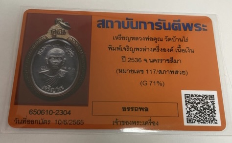 เหรียญเจริญพรล่างเนื้อเงิน หลวงพ่อคูณ บัตรสภาพสวย