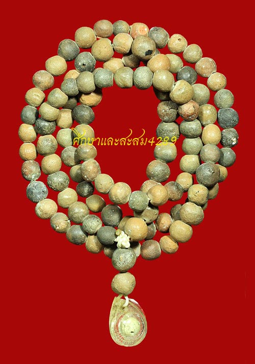 | ลูกประคำ 108 เม็ดเนื้อดินเผา เป็นลูกประคำที่ได้นำดินจาสถานที่ที่สำคัญต่างๆเช่นดิน 7 ท่า (น้ำ) , ข้าว 7 ทุ่ง (นา), ดินรังหมาร่า , ดินขุยปู ฯลฯ มาผสมกับผงพุทธคุณของหลวงปู่ เป็นวัตถุมงคลชุดหายากที่ปัจจุบันมีให้เห็นน้อยมาก ลูกประคำที่ลงในชมรมนี้ได้มาจากลูกศิษย์สายตรงมาเป็นเส้น 107 เม็ดไม่ครบจำนวนจึงนำลูกอมหรือลูกแก้วมณีนพรัตน์ที่เลี่ยมกันน้ำใส่เพิ่มให้ครบ 108 เม็ด ปัจจุบันใช้บูชาขออนุญาติโชว์ครับ |
