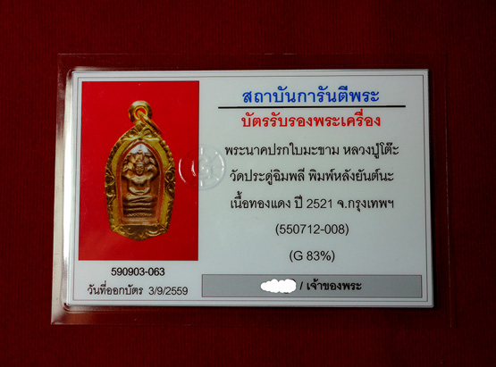 พระนาคปรกใบมะขาม หลวงปู่โต๊ะ วัดประดู่ฉิมพลี หลังยันต์นะ เนื้อทองแดง ปี 2521 กรุงเทพฯ พร้อมเลี่ยมทอง 83% พร้อมใบการันตี