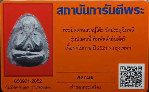 พระปิดตาปลดหนี้หลังยันต์ตรี หลวงปู่โต๊ะปลุกเสก 3 ไตรมาส ปี 2521-2523 ( เห็นนิ้วมือครบทั้ง10นิ้ว มีเส้นเกศา 4 เส้น ) พระปิดตารุ่นนี้สาเหตุที่เรียกว่ารุ่น"ปลดหนี้" เพราะว่าเวลาหลวงปู่หยิบพระพิมพ์นี้ให้ใครท่านจะกล่าวให้พรว่า "ขอให้หมดหนี้หมดสินนะ" และเป็นจริงอย่างที่หลวงปู่ท่านกล่าว หลวงปู่โต๊ะได้เมตตาปลุกเสกให้นานถึง 3 ไตรมาส ปี 2521-2523 ***พระเครื่องของพระอริยสงฆ์ที่อุทิศตนบำเพ็ญเพียรอย่างเคร่งครัดสม่ำเสมอ มีวัตรปฎิบัติที่งดงามมาตลอดชีวิตที่อยู่ในร่มกาสาวพัสตร์ เรื่องพระพุทธคุณศตกมลคงไม่ต้องบรรยาย หากผู้บูชาเป็นผู้ประพฤติตนดีตามคำสั่งสอนของหลวงปู่ กตัญญูรู้คุณ จะพบกับโชคลาภ เมตตา และแคล้วคลาด อย่างไม่ต้องสงสัย นับเป็นพระปิดตาที่หลวงปู่ใช้เวลาปลุกเสกยาวนานที่สุดถึง3ไตรมาส ซึ่งไม่เคยปรากฎว่า มีพระปิดตารุ่นใดที่หลวงปู่ปลุกเสกนานไปกว่านี้เลย ( ขอขอบพระคุณข้อมูลการสร้างจากหนังสือคุณประสิทธิ์ ปริชาน ) ............. องค์ที่นำลงประมูล เป็นเนื้อผงใบลานหลังยันต์ตรี บรรจุตะกรุดเงิน 1 ดอก วางอยู่ในตำแหน่งที่สวยและไม่เป็นสนิมเขียว มีเส้นเกศา 4 เส้น บริเวณใกล้ตะกรุดเงิน ข้อศอก ซ้ายพระ และด้านหลัง เห็นนิ้วมือครบทั้ง 10 นิ้ว เห็นกำไลข้อเท้า ไม่มีอุดซ่อม พระดูง่ายมากๆ ตามองค์พระยังมีนวลแป้งโรยพิมพ์เดิมๆ *****( สำหรับพระปิดตาปลดหนี้หลังยันต์ตรีส่วนใหญ่จะกดพิมพ์ได้ไม่สวย และไม่ค่อยเห็นนิ้วมือ) ............... *สนใจเชิญร่วมประมูล รับประกันพระแท้ด้วยเครดิต"ศตกมล" รับผิดชอบตามกฎ กติกาของ G-PRA ทุกประการ