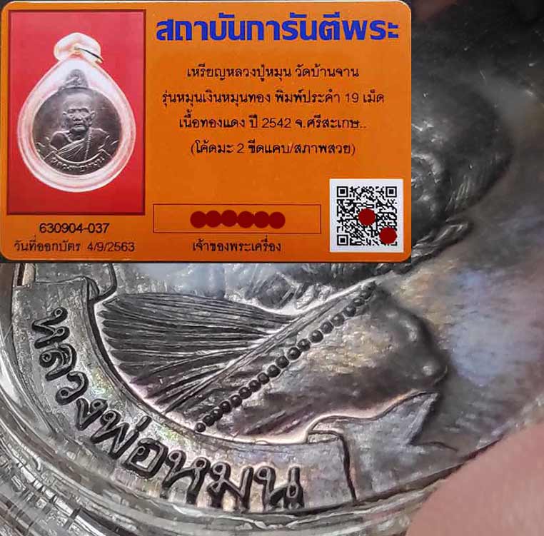 เหรียญ หมุนเงินหมุนทอง หลวงปู่หมุน บล็อกนิยมสุด ประคำ19เม็ด รุ่นเจริญลาภ2542 พร้อมบัตรการันตีพระ สภาพสวย