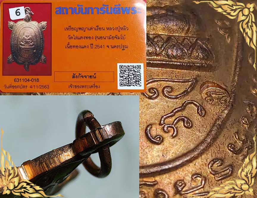เหรียญพญาเต่าเรือน หลวงปู่หลิว วัดไร่แตงทอง จ.นครปฐม เนื้อทองแดง รุ่น สร้างอนามัย(จัมโบ้) ปี2541 บล็อกตัวตัดทองคำ สวยๆพร้อมบัตร