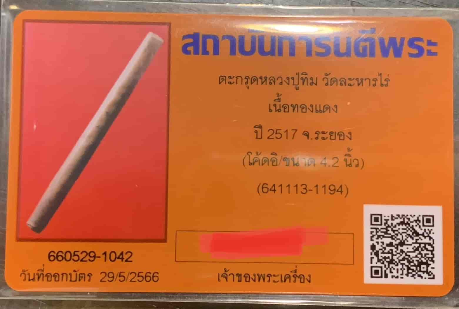 ตะกรุดหลวงปู่ทิม วัดละหารไร่ เนื้อทองแดง ปี 2517 จ