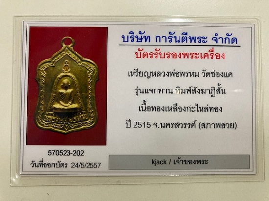 | เหรียญแจกทานกะไหล่ทอง หลวงพ่อพรหม(บัตรสภาพสวย) |