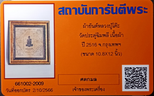 เป็นผ้ายันต์ที่ไม่ค่อยพบเห็น เป็นผ้ายันต์ที่หายาก ทันหลวงปู่ปลุกเสก มีทั้งสีขาว และสีแดง จุดในการพิจารณาต้องดูและจดจำลายผ้า ลักษณะการทอ ความถี่ ความห่าง ขนาดของเส้นด้าย เป็นหลักในการพิจารณา แยกแยะเก๊-แท้ ........ผืนที่นำลงในชมรมเป็นผ้ายันต์ รูปเหมือนหลวงปู่โต๊ะสังฆาฏิยาวสีขาว สภาพสวยไม่มีรอยขาด สกรีนเต็มเห็นยันต์ครบ ที่พบบางผืนจะสกรีนเป็นเงาดำ ไม่เห็นหน้าของหลวงปู่อย่างชัดเจน แต่ผืนนี้ด้านหน้าเห็นเป็นใบหน้าหลวงปู่ มีคราบความเก่าตามระยะเวลา ใส่กรอบพร้อมแขวนบูชา